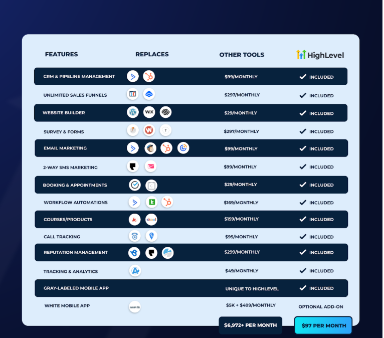 GoHighLevel sweeps aside the need for ClickFunnels, Mailchimp, ActiveCampaign, Calendly, HubSpot, Salesforce, Teachable, WordPress, and many others. It unites them under one banner, saving time, money, and effort.